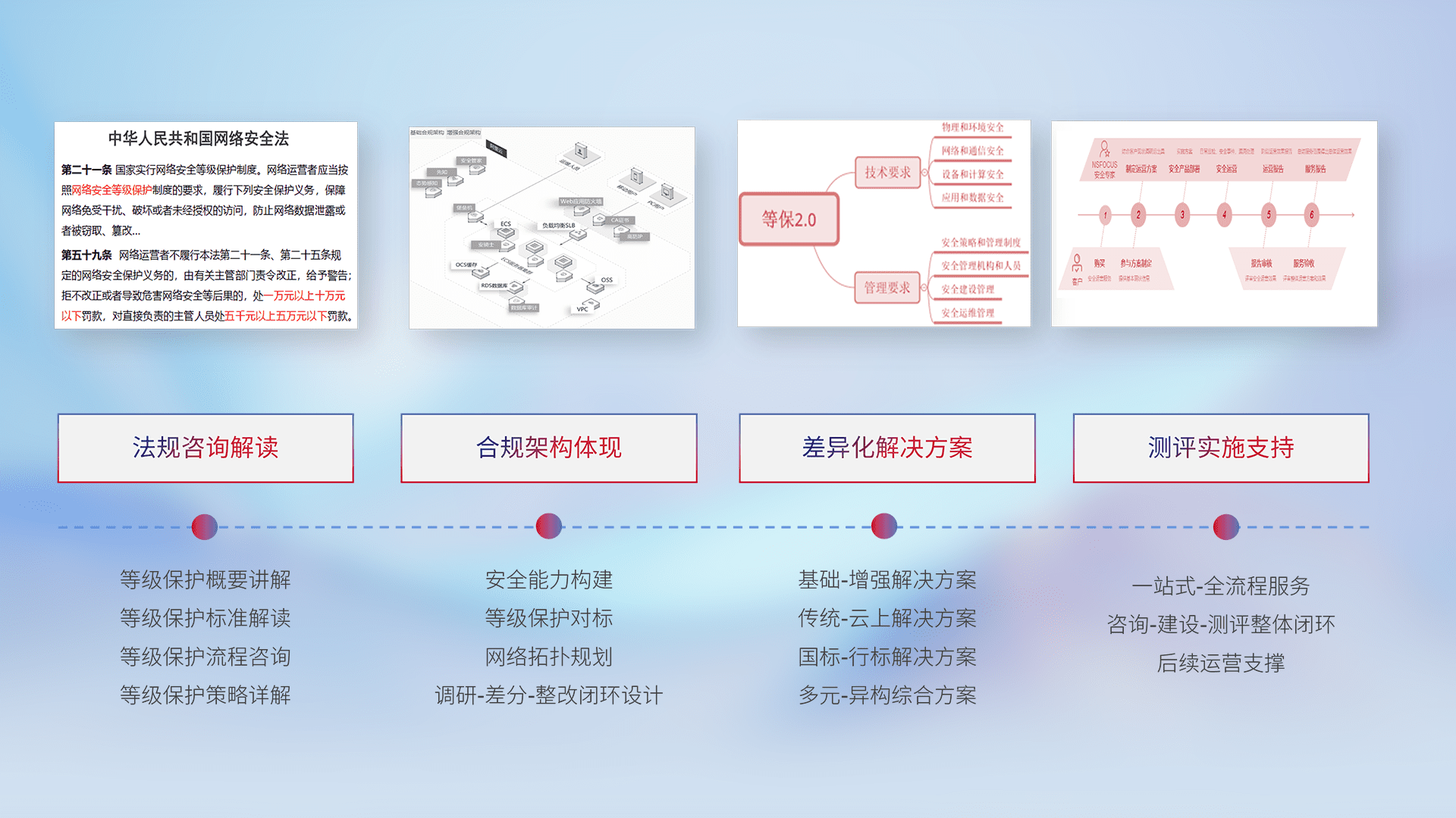 通过专业的法律咨询解读、、、合规架构体现、、差异化解决方案、、测试实施支持等服务,,,为客户量身打造等保合规体系。。。。